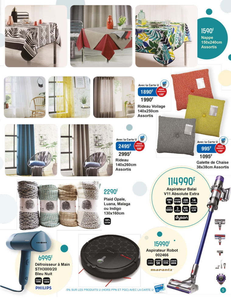 Coté déco, pour mieux aménager votre maison, ne manquez pas les promos sur les galettes de chaises à 995 F, les voilages et rideaux assortis, les tapis de bain et les nappes à 1590F, il y en a pour tous les gouts.