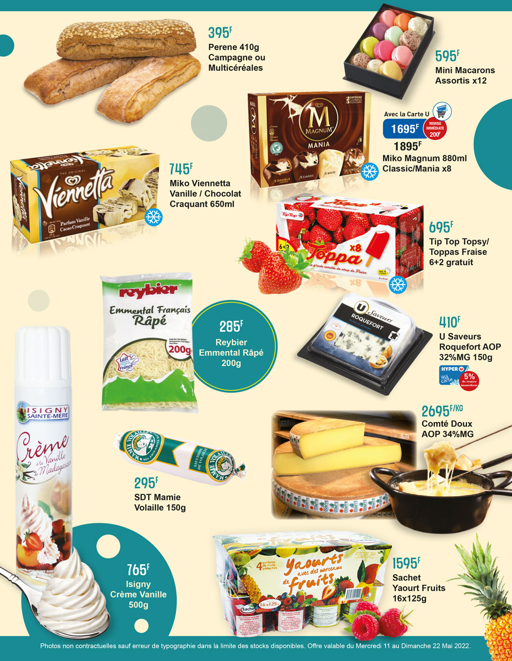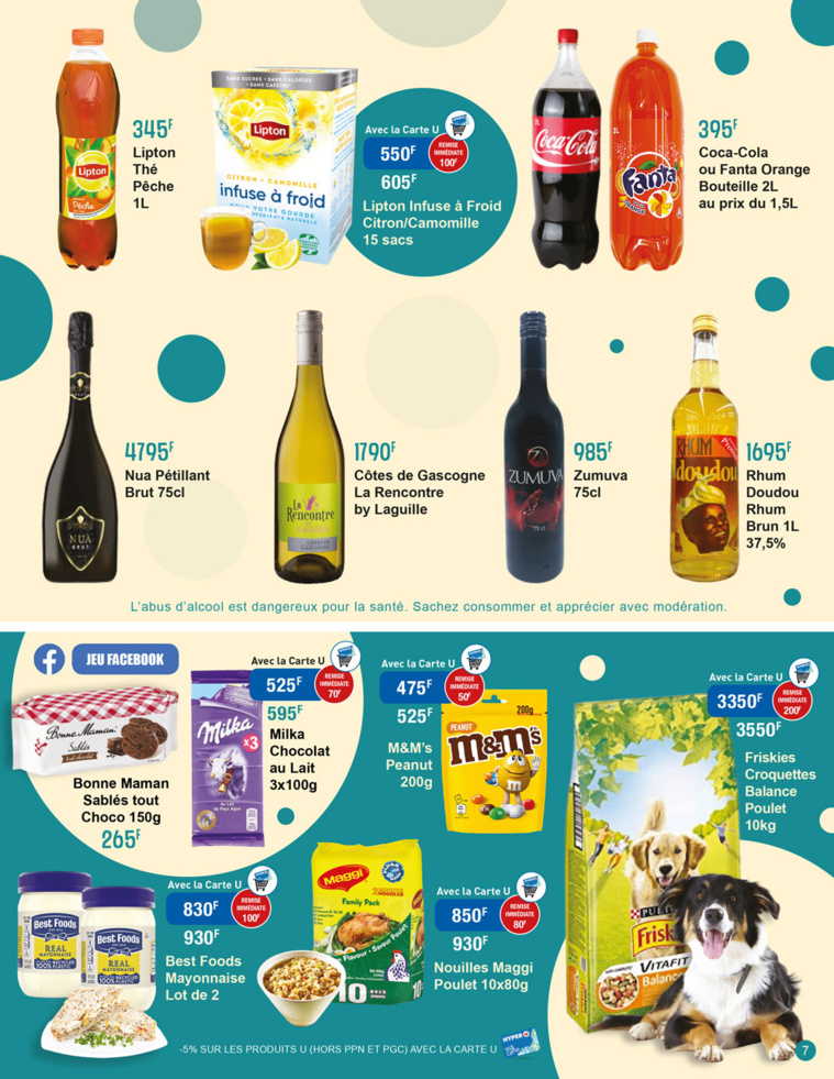 Hyper U ne néglige jamais les petits plaisirs gustatifs et ce catalogue met en avant des produits alimentaires tels que les glaces Magnum, les sablés tout Choco de Bonne Maman, la mayonnaise Best Foods mais aussi des chocolats Milka et M&M’s. D'autres produits sont à l’honneur comme la bouteille de 1L de Lipton à 345F ou avec les bouteilles de deux litres de coca et de Fanta à 395 F. Quant aux plats chauds, rien de tel qu’une bonne fondue savoyarde avec le comté à 2695F/kg que vous pourrez accompagner d'une bouteille de vin blanc Côtes de Gascogne « la rencontre » dont son prix imbattable est fixé à 1790 F. Le chien aussi n’est pas oublié puisqu’il peut se régaler de ses croquettes Friskies à 3550 F.