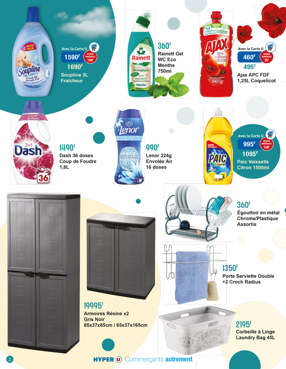 Pour la buanderie découvrez les corbeilles à linge de 45 L à 2195 F seulement et de nombreux produits de lessive comme la bouteilles d’1,8 L de Dash (36 doses) à prix réduit, l’assouplissant Soupline à 1590 F avec la carte U, et les 16 doses de Lénor à 990 F seulement !