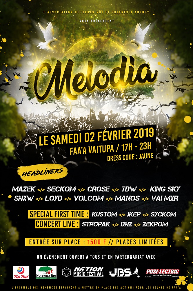 Le concert Melodia est organisé par l’association Hotuarea Nui (représenté par Yannick Tevaearai) et Polynesia Agency (représenté par Wilfred Johnston). L'événement aura lieu ce samedi 2 février à Vaitupa sous le grand chapiteau communal de faa’a de 17h à 23h. La manifestation est ouverte à tous et sans alcool.