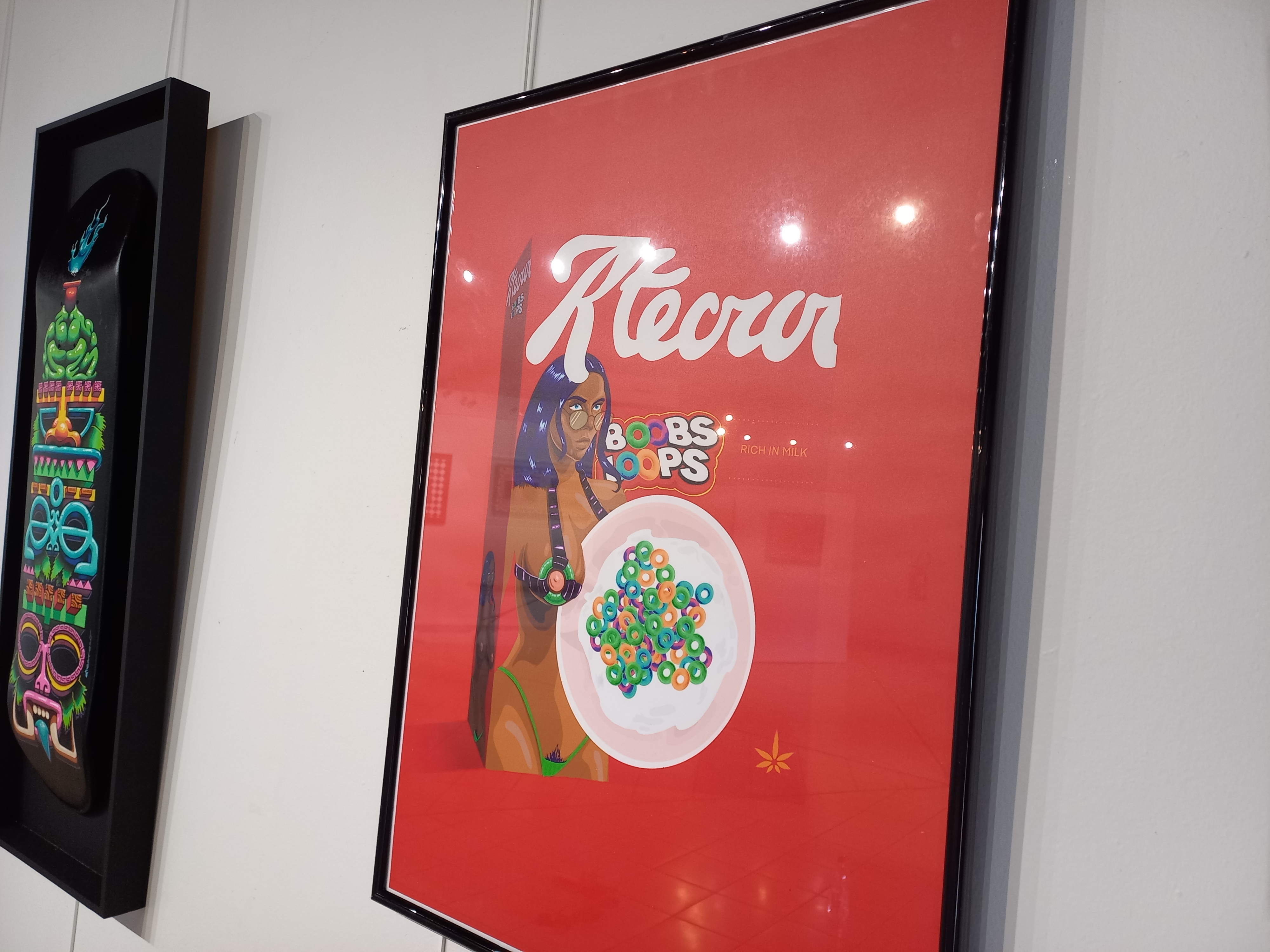 Il dépose sur différents supports (toile, plexiglas, surf, skate), tout ce qui lui passe par la tête. “Je mets tout ce qui me plaît, la culture, la musique, les sports de glisse.” Il ne prétend pas transmettre de messages particuliers.