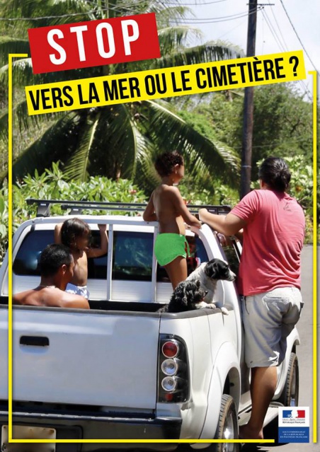 PAPEETE, le 26 novembre 2018. L'adolescente de 13 ans et les deux hommes décédés ce week-end à Nuku Hiva après une chute de plusieurs mètres de leur 4x4 ne portaient pas de ceinture de sécurité. Le conducteur, qui s'était attaché, a eu la vie sauve. Le haut-commissariat vient de réaliser cinq affiches de prévention. Le but : changer les comportements pour que la ceinture et le casque deviennent un automatisme.