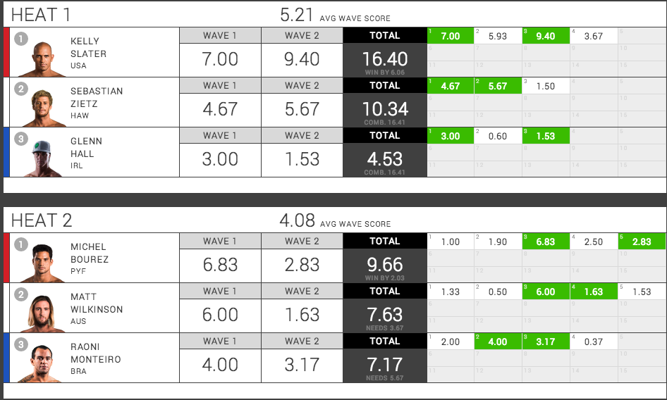 Avant Michel Bourez, c'est un autre habitué de Teahupo'o qui s'est illustré sur la vague mythique du 'PK 0' : l'Américain Kelly Slater, qui en scorant 16,40 pts, a facilement pris l'avantage sur ses concurrents l'Hawaiien Sebastian Zietz (10,34 pts, N°19 Mondial) et l'Irlandais Glenn Hall (4,53 pts, N°33 Mondial). Kelly Slater a notamment accroché une superbe vague notée 9,40 pts à son compteur, de quoi lui assurer sa qualification pour le round 3.