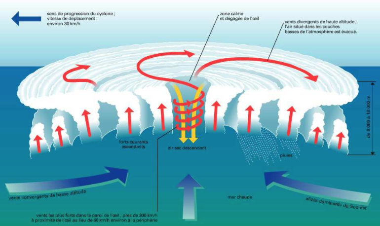 C’est un gigantesque tourbillon d’air chaud et humide à axe vertical de 500 à 800 km de diamètre et de plus de dix kilomètres de hauteur. Il naît obligatoirement au-dessus de la mer, seulement lorsque la température de l’eau dépasse 26°centigrades sur une étendue de plusieurs millions de kilomètres carrés et sur une épaisseur de 50 à 100 mètres ; cela permet à l’air en contact avec les eaux chaudes de s’échauffer et de s’humidifier. Il se manifeste par des vents tourbillonnaires extrêmement violents, une mer très grosse à énorme et des masses nuageuses très importantes accompagnées de pluies torrentielles.