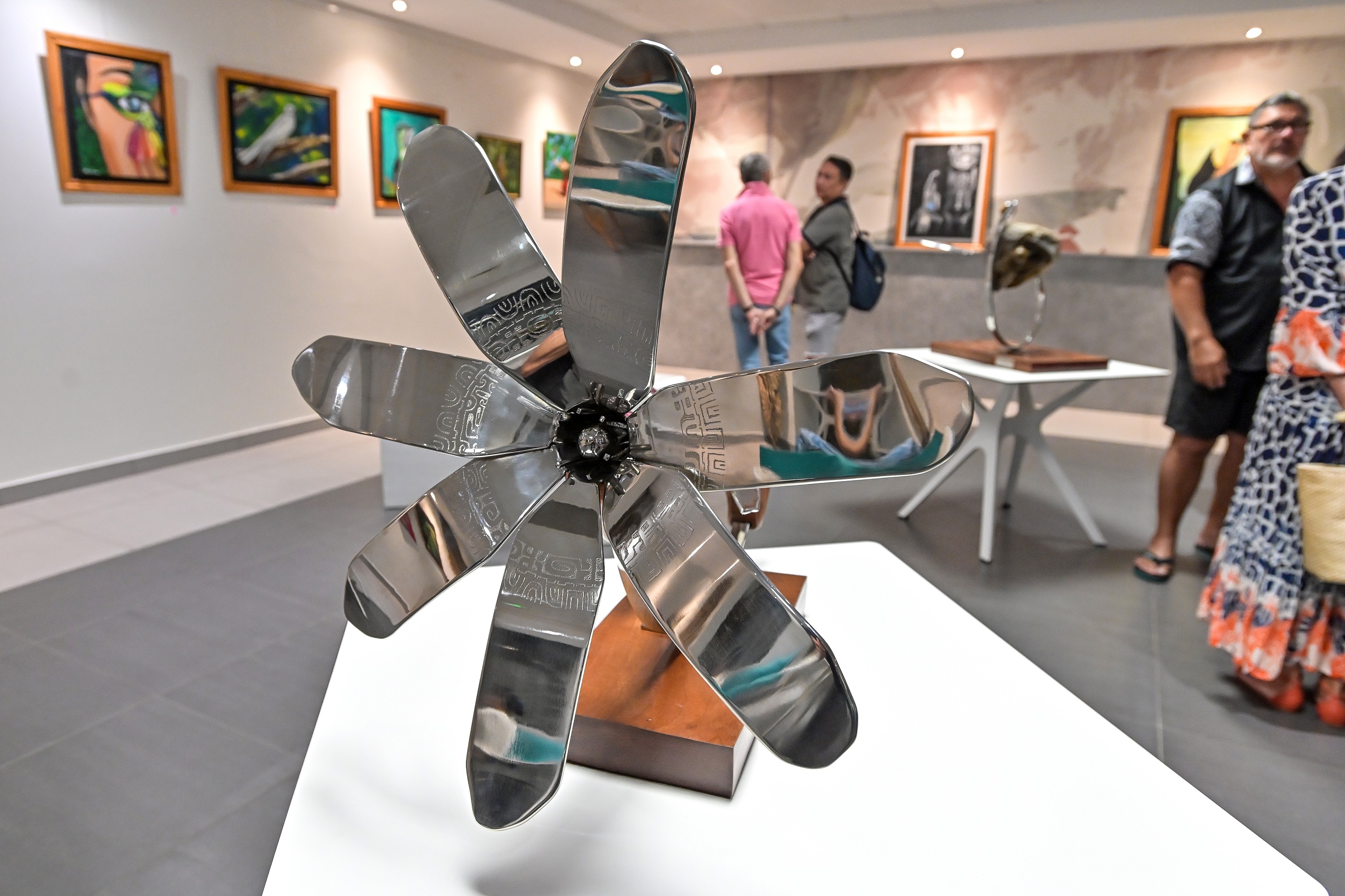 De son côté, Jean-Paul Teuira dévoile son ingéniosité et sa sensibilité artistique avec ses sculptures mêlant bois et inox. Cette combinaison ingénieuse, particulièrement adaptée au climat de Tahiti où l’inox résiste à la rouille, donne vie à des créations remarquables. Les œuvres de Jean-Paul, finement travaillées et agrémentées de tatouages gravés sur l’inox, reflètent un savoir-faire d’exception et une attention aux détails qui ne laissent personne indifférent.