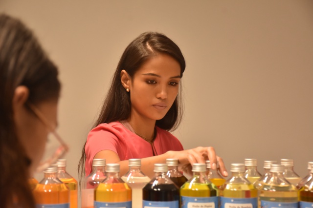 Eau de rose, de bleuet, d’oranger ou de vanille : le nez dans les flacons, les apprentis chimistes ont du mal à faire leur choix. Heureusement la formulatrice Kelly veille au grain, passant dans les rangs pour glisser quelques astuces. Comme celle de passer rapidement le nez sur une ligne de trois à quatre parfums. « Si tu les changes de place, ou que tu rajoute un cinquième parfum, sa change l’orientation de ton parfum, tu peux jouer sur quelque chose de plus gourmand, ou de plus frais... » conseille la spécialiste. C’est d’ailleurs l’étape la plus longue, celle de d’élaboration du parfum, avant de personnaliser le soin et ensuite de définir l’aspect du produit avec l’exfoliant. Au total, il faudra compter trois heures.