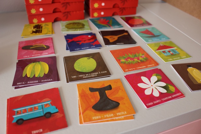 Lorsqu'elle est arrivée sur le territoire. Mme Carotte avait un atelier en ville. Un espace qu'elle a laissé pour travailler chez elle pendant quelques années. Devenue maman, elle a commencé par fabriquer un memory. "Je voyais mes filles lire des livres ou jouer à des jeux dont les références n'étaient pas celles de la vie d'ici et dont les graphismes, pour être honnête, ne me plaisaient pas." Le memory de Mme Carotte compte 16 paires d'objets locaux (ukulele, tiare, fare, truck, pirogue, vanille, uru,…) dont le nom est écrit en français, anglais et tahitien. "Car l'apprentissage des langues est aussi quelque chose qui me tient à cœur".