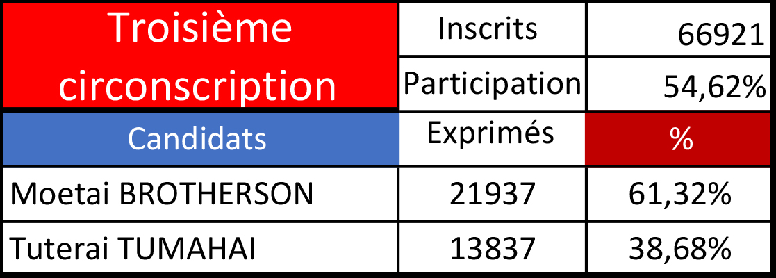 L’autre enseignement de ce second tour est la formidable poussée du vote Brotherson sur les communes des îles Sous-le-Vent. Et là encore, sans doute, l’expression d’un vote anti-Tapura. Le député sortant prend l’avantage à Bora Bora en multipliant par trois ses voix (2 217), là où Tumahai peine à les augmenter de 25% les siennes en passant de 1 560 à 2 033. Le député sortant passe en tête à Taha’a, à Taputapuātea, à Tumara’a et reste largement devant à Uturoa. Il n’y à guère qu’à Huahine que Tuterai Tumahai finit en tête, encore qu’avec une avance tout à fait modeste de 44 voix et un score de 1 747 suffrages, sensiblement identique à celui du premier tour, là où Brotherson multiplie le sien par 2,5. Dans l’ensemble, sur les Roromatai, Brotherson engrange 6 266 voix de plus qu’au premier tour, tandis que Tumahai plafonne à 2 089 voix de plus.
