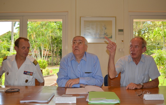 De gauche à droite : général Paul Fouilland, contrôleur général de l'armée en charge des travaux de rénovation de Telsite à Moruroa ; Bernard Dupraz, délégué à la sûreté nucléaire et à la radioprotection ; docteur Frédéric Poirrier, chef de département de suivi des centres d'expérimentation nucléaire de la direction générale de l'armement.