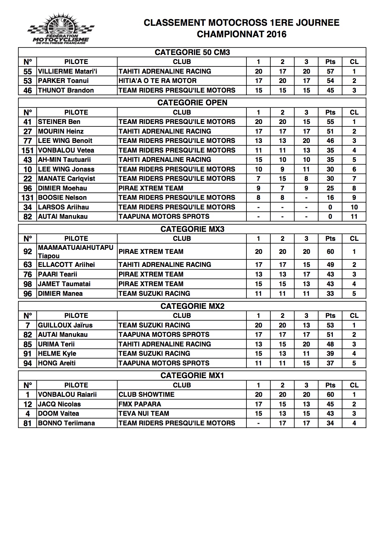 En MX2, c’est l’inusable Jaïrus Guilloux qui prend la première place suivi de l’excellent Manukau Autai qui a réalisé de belles attaques, Terii Urima complètant le podium. C’est Tiapou Maamaatuaiahutapu qui s’impose en MX3, talonné par Ariihei Ellacott et Tearii Paari qui prend la troisième place.