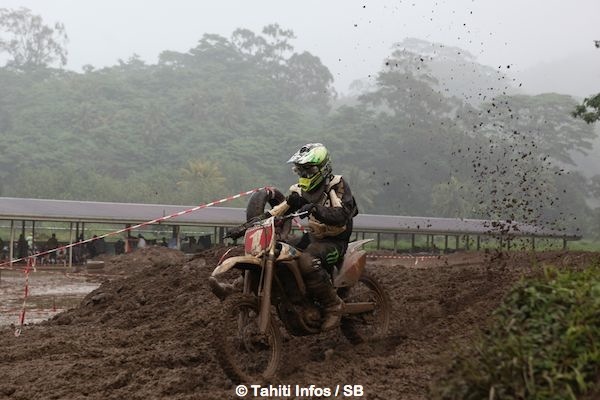 TARAVAO, le 4 juin 2015. C’est sur le terrain de Vaitarua à Taravao que les aficionados de motocross se sont retrouvés pour la 2e journée de championnat qui s’est faite dimanche sur un terrain de cross boueux, en raison des intempéries. Il en fallait plus pour décourager nos pilotes qui se sont simplement adaptés à ces conditions. C’est encore Raiarii Vonbalou du club Show Time qui s’est imposé en remportant les trois manches de la catégorie reine MX 1.