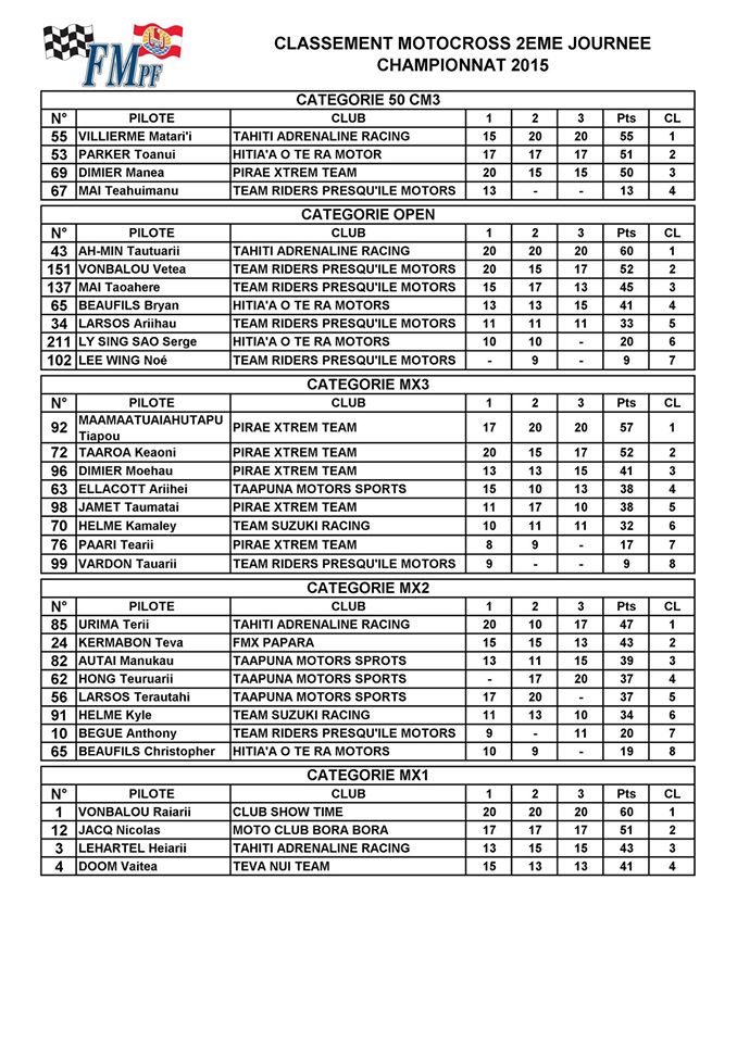 En catégorie MX 2 et MX 3 les pilotes étaient plus nombreux avec 8 pilotes au départ de chaque catégorie. C’est Terii Urima qui s’impose sur le total des trois manches, devant Teva Kermabon et Manukau Autai. En MX 3 c’est Tiapou Maamaatuahiahutapu qui s’impose devant Keaoni Taaroa et Moehau Dimier.