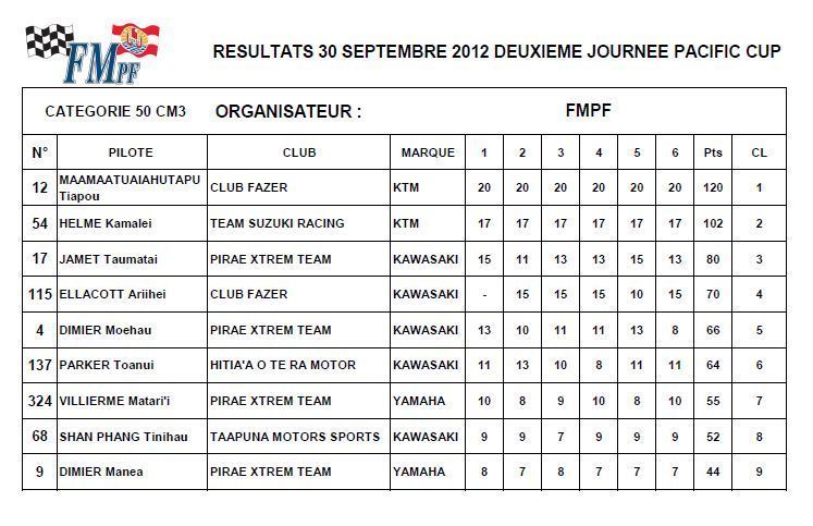 Raiarii Vonbalou devance le Calédonien Wilrick Cabanilles de 3 points au général. Daryl Hurley, 3ème au général, gagne pas moins de trois manches, mais il ne marquera aucun point dans 2 manches suite à un guidon cassé et à une chute spectaculaire dans la dernière manche.