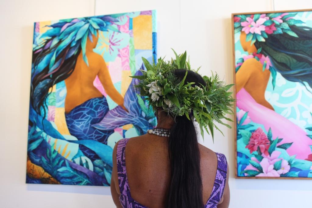 Cette exposition est "le savant mélange du souffle marin et des senteurs de la terre", résume Vaiana Drollet, galeriste. Sur les toiles posent des vahine.