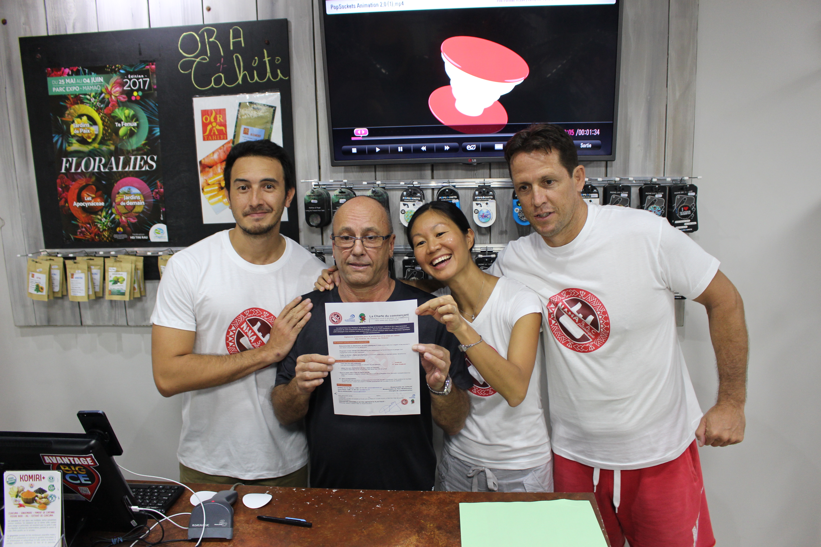 PAPEETE, le 9 juin 2017 - Le collectif Nana sac plastique passe à l’action. Il propose aux commerçants une charte à signer en échange de quoi les commerçants reçoivent un macaron et sont mis en lumière. Loïc Dabb installé dans la galerie d’Odyssey a fait le premier pas ce jeudi.