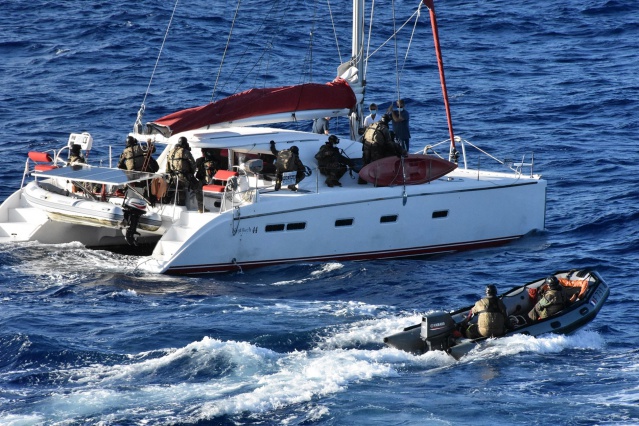 Comme le prévoit le droit international de la mer, l’exercice comprenait une demande fictive adressée à l’État étranger du pavillon pour obtenir l’autorisation d’intervenir sur le voilier affrété à l’occasion entre Tahiti et Moorea, ainsi qu’un transfert à la France de la compétence juridictionnelle en vue de pouvoir juger les trafiquants présumés.