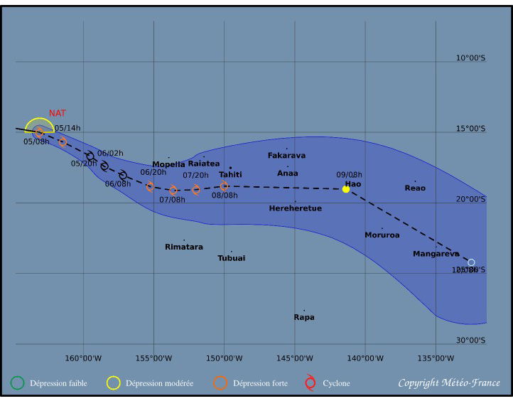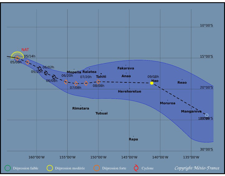 Avec un déplacement plus lent que prévu, Nat devrait circuler au Sud de Mopelia mardi, puis successivement au Sud des Iles-sous-le-Vent et des Iles du Vent mercredi et jeudi.