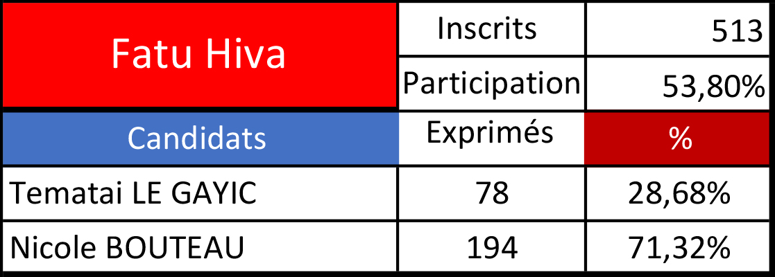 Tahiti, le 18 juin 2022 - Nicole Bouteau l'emporte à Fatu Hiva avec 194 voix (71,3%) face à Tematai Le Gayic et ses 78 voix (28,7%), au second tour des élections législatives.