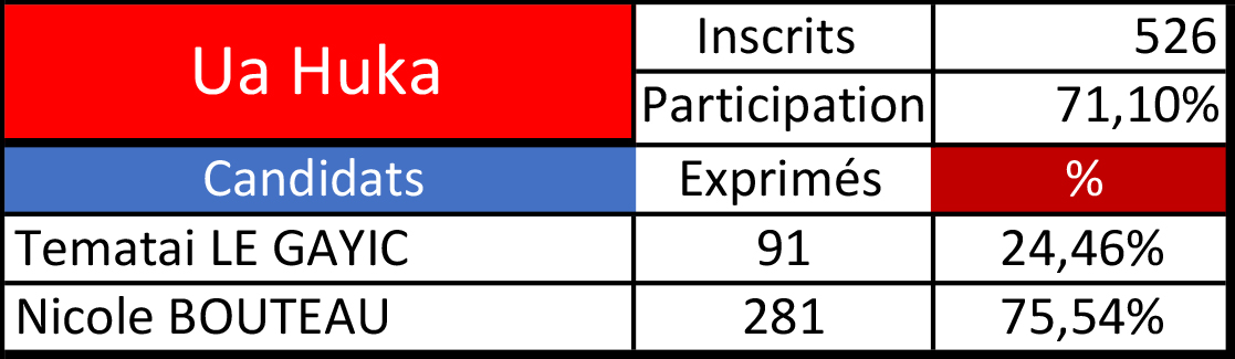 Tahiti, le 18 juin 2022 - Nicole Bouteau l'emporte à Ua Huka avec 281 voix (75,5%) face à Tematai Le Gayic et ses 91 voix (24,5%), au second tour des élections législatives.