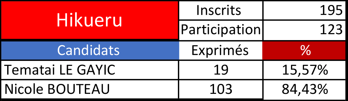 Tahiti, le 18 juin 2022 - Nicole Bouteau l'emporte à Hikueru avec 103 voix (84,4%) face à Tematai Le Gayic et ses 19 voix (15,6%).