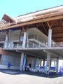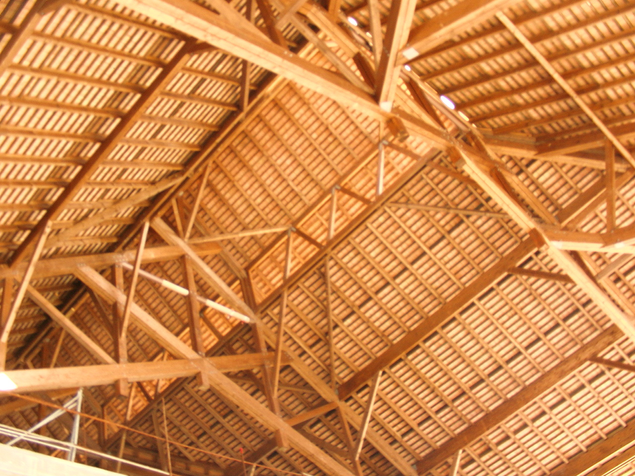 La charpente et la toiture entièrement réalisés en tuiles de bois représentent un ouvrage remarquable et le bâtiment s'impose déjà par sa structure impressionnante dans le paysage de la ville.