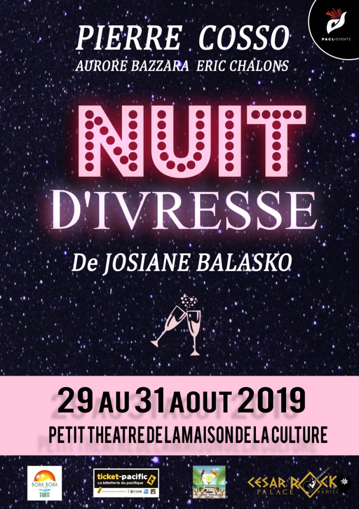 PAPEETE, le 19 août 2019 - La pièce de théâtre, Nuit d’ivresse, a été écrite et jouée par Josiane Balasko au Splendide en 1985. Pierre Cosso, qui rêvait de le monter à son tour, concrétise son projet. Il sera sur la scène du Petit théâtre avec Aurore Bazzara et Éric Chalons à la fin du mois.