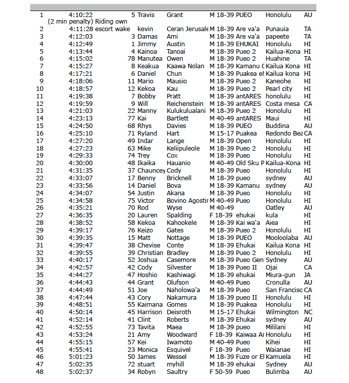 Kévin Céran Jerusalemy avait franchi la ligne en 1er en 4H09’28s mais à l’issue de la course il a été pénalisé de deux minutes pour avoir surfé les vagues de son bateau suiveur. Du coup, il a été rétrogradé à la seconde place. C’est Travis Grant, 2ème au scratch qui remporte donc la course en 4H10’22s. Damas Ami, malgré avoir fini sur le récif, prend la 3ème place en 4H12’03s. Manutea Owen, prend lui la 6ème place en 4H15’02s.