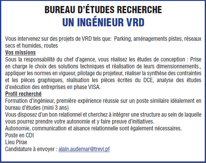OFFRE EMPLOI- BUREAU D’ÉTUDES RECHERCHE UN INGÉNIEUR VRD