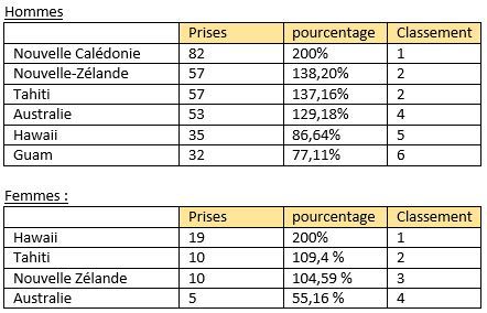 L'équipe féminine, elle, était composée de Taina Orth et Onyx Lebihan. Malgré une mauvaise première journée, où Hawaii a pris le large dans les scores avec trois fois plus de prises qu'elles, elles ont réussi à assurer la deuxième place lors de la deuxième journée, se plaçant in extremis devant les néo-zélandais.