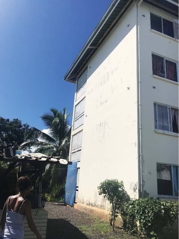 Situé à l'entrée du quartier OPH Les Hauts du Tira dans le quartier de La Mission à Papeete, ce graff est signé Millo. L’artiste italien se reconnait par son style plus minimaliste et enfantin. Sur cette façade murale grandiose, Millo peint un géant qui interagit avec son environnement pictural de manière ludique.