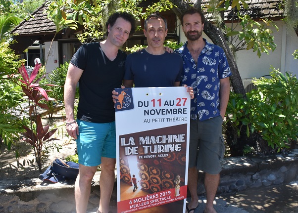 C’est en 2018 que les comédiens, Benoît Solès et Amaury de Crayencour, et le metteur en scène, Tristan Petitgirard, ont finalisé leur spectacle “La machine de Turing”. Ils attendent de se produire à Tahiti depuis 2020 et ont enfin fixé les dates de leurs onze représentations, dont deux dédiées aux établissements scolaires, sur la scène du petit théâtre de la Maison de la culture. Les rendez-vous sont programmés du 11 au 27 novembre, en fin de semaine : les vendredis et samedis, à partir de 19h30, et les dimanches, à partir de 17 heures. Les jeudis 17 et 24 sont réservés aux scolaires, à partir de 9 heures.