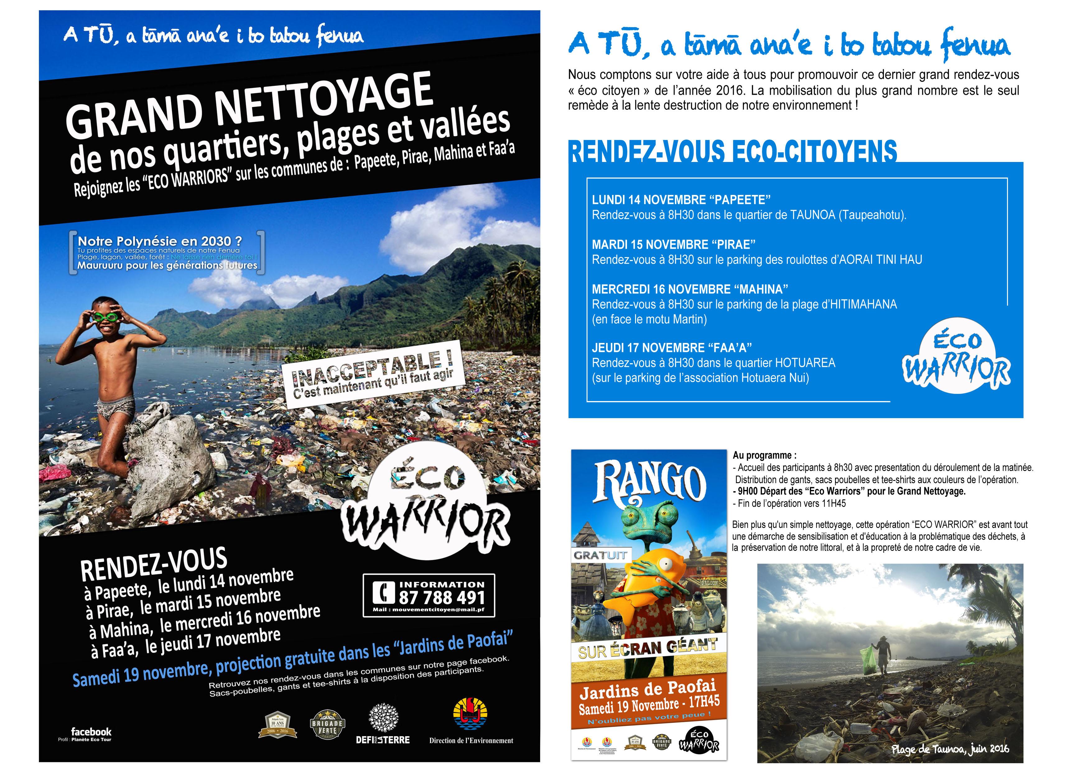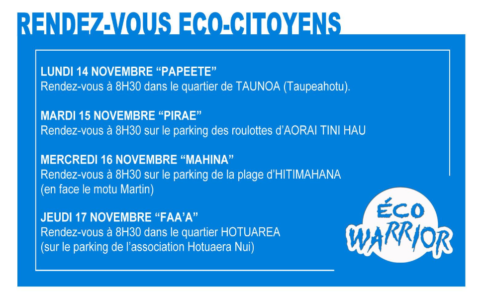 PAPEETE, le 14 novembre 12016- L'opération "Eco warrior" a débuté ce lundi 14 novembre sur la commune de Papeete dans le quartier de Taunoa et sur le littoral de littoral de Taupeahotu. La récolte de déchets a été fructueuse et nous rappelle à quel point il reste encore des efforts à faire du coté des citoyens pour atteindre l'objectif propreté.