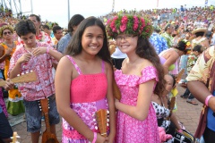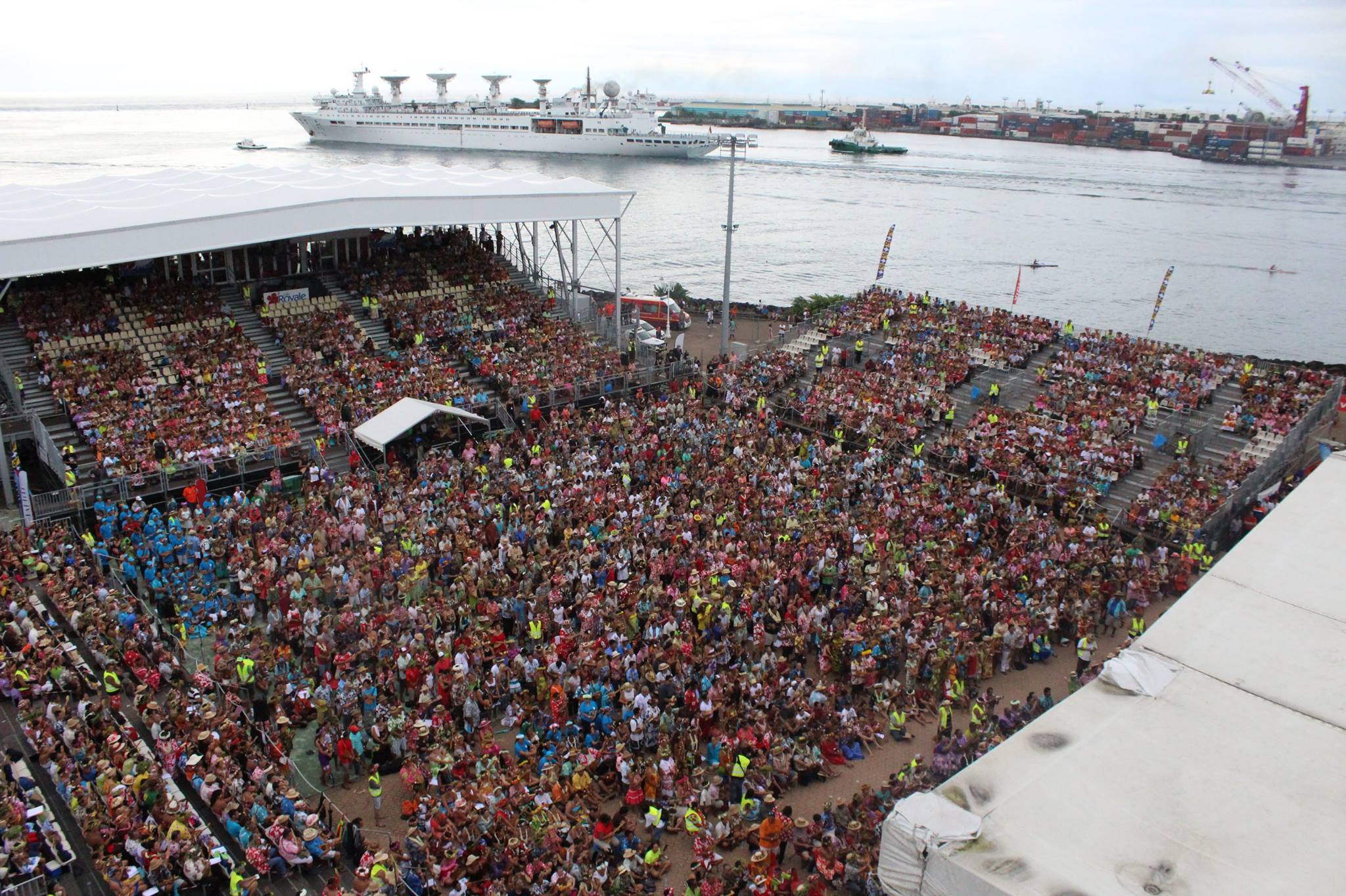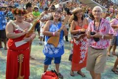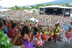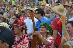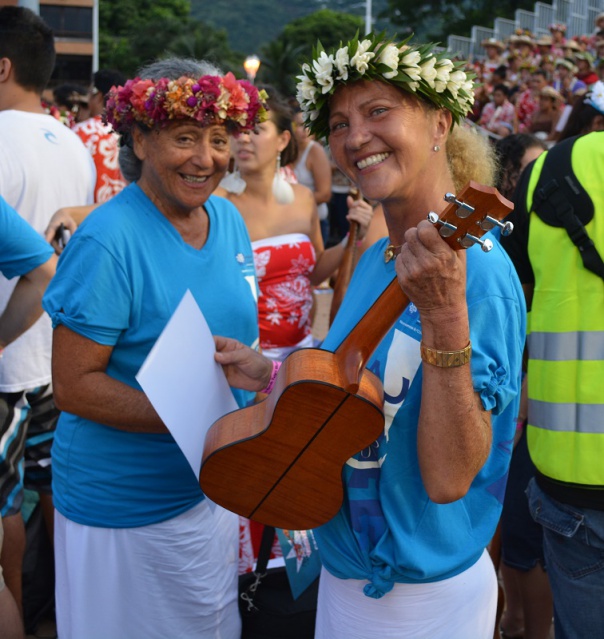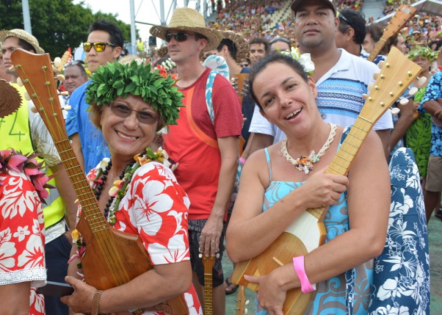 Malgré quelques averses, énormément de queues et une heure de retard (le temps d'arriver à remplir le moindre espace légalement utilisable de Toa'ata), rien n'a arrêté la foule de musiciens. C'est que l'attente était musicale, familiale et colorée puisque presque tous les ukulelistes sont venus en tenues locales. Les 3000 personnes qui ont dû rester à l’extérieur de l’enceinte faute de place ont pu jouer et chanter en même temps que ceux à l'intérieur grâce à un écran géant aménagé pour eux.