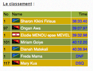 Lors du 10 000m Femmes, Elodie Menou prend la 3ème place en 39’32″98, après la disqualification de la papoue Marie Kua.