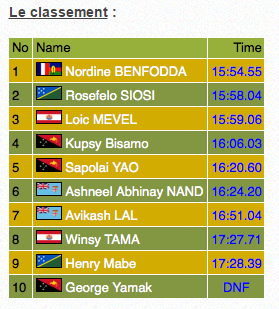 Au 5000m, Loïc Mevel allait imiter sa mère, en montant sur la troisième marche du podium en 15’59″06, juste derrière le salomonais vainqueur du 10 000m. C’est le calédonien, Noredine Benfodda qui prend la première place en 15’54″55.