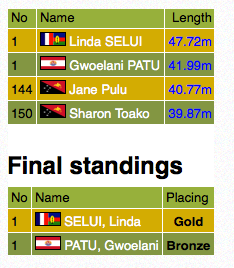 Enfin au Javelot, c’est notre jeune athlète de Taha’a, Gwoelani Patu qui récolte le bronze avec un jet à 41’99m. La calédonienne Linda Selui remporte l’or avec un lancer à 47’72m.