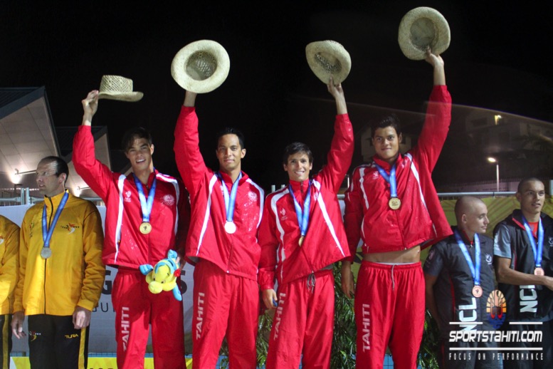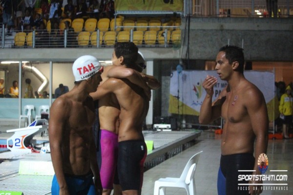 Le clou de la soirée fût le relais 4X100 4 nages. Composé de Teiki Dupont, Rainui Teriipaia, Hugo Lambert et Stéphane Debaere, le team tahiti a fait sensation en terrassant le relais papou avec un nouveau record des jeux en 3’48″40. La Papouasie, emmené par Ryan Pini, prend la deuxième place en 3’49″53 et la calédonie complète le tiercé gagnant en 3’51″53.
