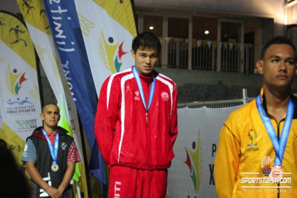 Teiki Dupont sur 200m dos n’a laissé aucune chance à ses adversaires en bouclant sa course en 2’12″49. Il met son poursuivant, le calédonien, Hugo Tormento à 5 secondes soit 2’17″81. Et c’est un autre calédonien, Kevin Calmettes qui complète le podium en 2’18″71. Une finale sans Ryan Pini, le champion papou, qui a préféré se préserver pour la finale du 4X100m 4 nages…