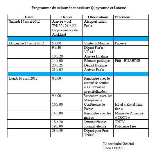 PS: Programme du séjour de Mrs Queyranne et Lataste du samedi 14 avril au lundi 16 avril.