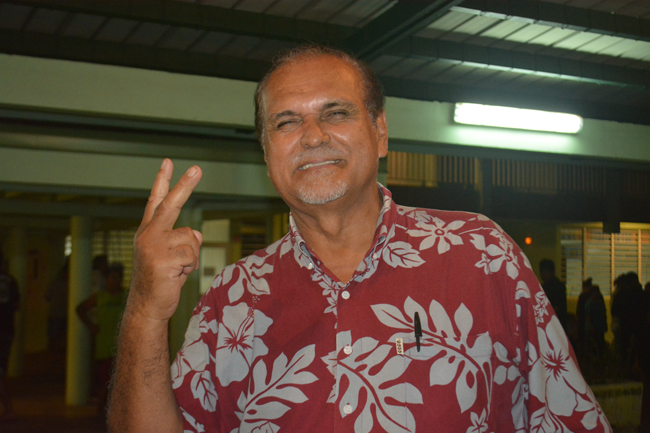 PAEA, le 23 mars 2014. Les électeurs ont attendu les résultats pendant longtemps dans la cour de l'école Vaiatu où se rassemblent les huit bureaux de vote de la commune. Jusqu'au dernier moment, le suspense est maintenu et ce n'est que vers 21h30 passées que les annonces sont faites au micro. Avec 43,13% des voix, le maire sortant Jacquie Graffe et sa liste "dissidente" du parti Tahoeraa sortent vainqueurs de cet étrange duel orange. Les applaudissements et les cris de joie des supporters sont nourris pour celui qui est leur tavana depuis 40 ans et qui a suivi ce premier tour des municipales 2014 depuis son lit d'hôpital, après une brève apparition ce matin.