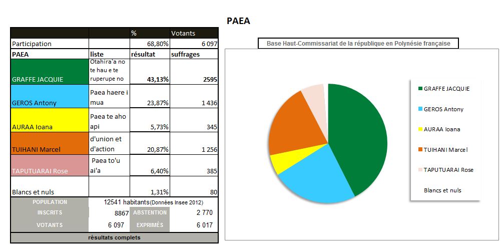 Les deux autres listes engagées à Paea se contentent de petites miettes. Moins de 400 voix à peine, pour chacune des deux femmes têtes de listes de ces élections municipales. Pas assez ni pour l'une, ni pour l'autre pour se maintenir, à moins qu'elles ne soient sauvées in extremis dans le cadre d'une fusion. Pour Ioana Teupoohuitua qui était soutenue par le parti A Ti'a Porinetia cela pourrait signifier une sortie du conseil municipal où elle était entrée en 2008, après avoir fait alliance avec Antony Géros. Même sanction pour Rose Deane, ex deuxième adjointe au maire de Paea qui "a essayé", mais a perdu.
