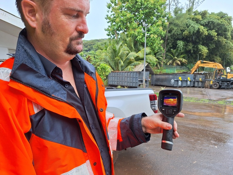 Tout est revenu à la normale, ou presque. Les ordures ménagères sont stockées en amont de la zone incendiée, le temps que celle-ci soit entièrement sécurisée. Des “points chauds” persistent et doivent être éteints avant d’être recouverts de terre pour permettre la reprise de l’exploitation de cette partie du casier 9B. Cette mission incombe à Jérôme Camus, responsable d’exploitation pour Enviropol, équipé d’une caméra thermique mobile : “Cet outil me permet d’aller vérifier les points chauds pour lutter contre les feux couvants. Après une semaine, on n’a plus de flammes, mais il y a encore des risques. On reste vigilants pour éviter une reprise : la semaine dernière, on a fait revenir nos agents en astreinte et les pompiers plusieurs fois entre jeudi et samedi, parce qu’il y avait de nouveaux départs de feu”. Un drone équipé d’une caméra thermique a également été mobilisé pour avoir une vision complète de la zone et guider le conducteur de la pelle mécanique mobilisé sur les fouilles.