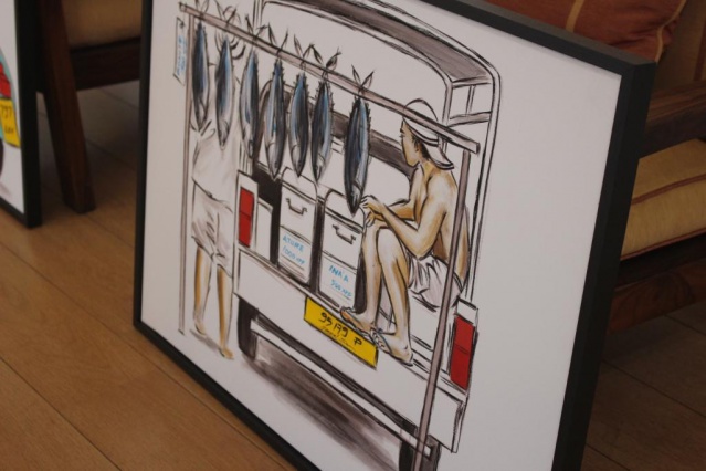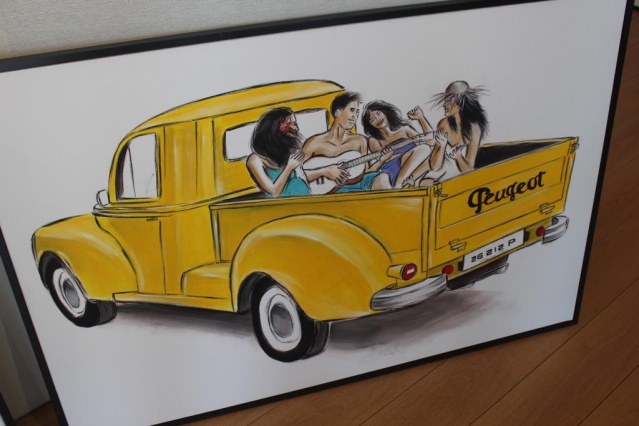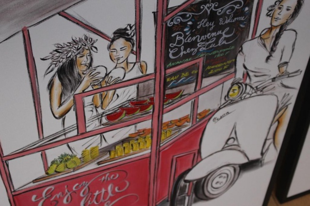 "Ce qui m’inspire", dit l’artiste peintre Pascal Sun, alias Sun, "c’est la vie à Tahiti, les scènes de tous les jours, comme un homme avec une guitare, un couple dans une benne, une danseuse…"