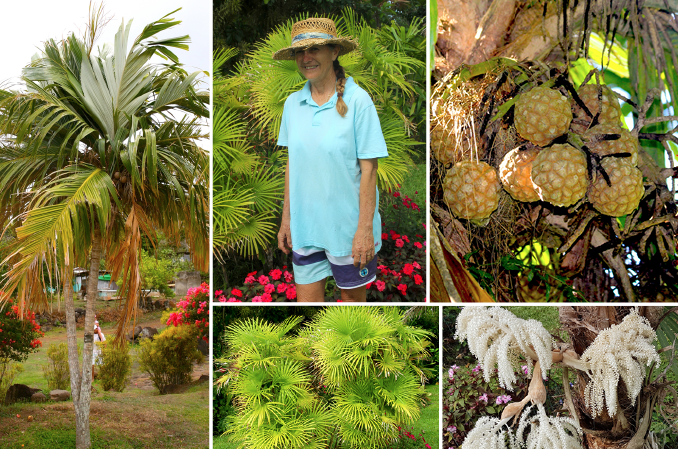 Patricia Frébault fut notre guide dans le vaste monde des palmiers. Elle en cultive une cinquantaine d’espèces, dont de très rares, à Puunui où elle réside.