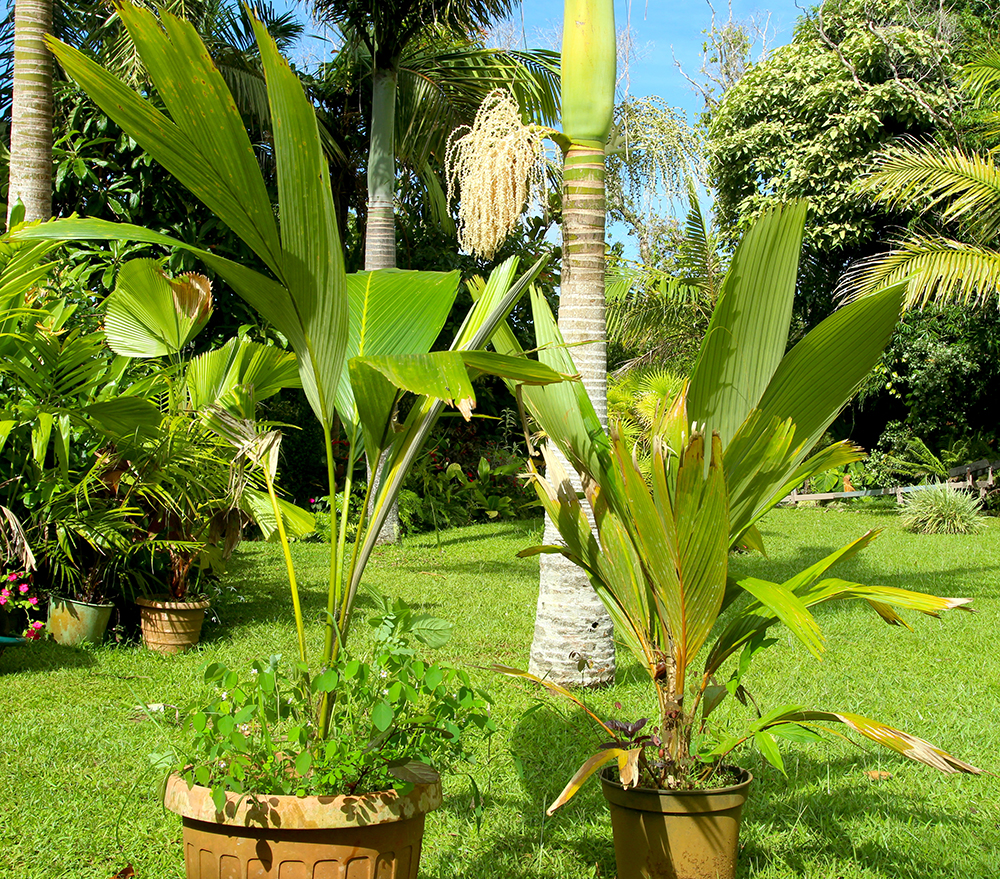 Une précision tout de même avant de clore cette introduction à la “passion palmiers” de Patricia, les espèces que nous vous présentons aujourd’hui ne se trouvent pas forcément toutes dans son jardin. Nous avons profité de cette balade à Puunui pour balayer à grands traits le monde des palmiers devenus tahitiens, puisqu'avant l’arrivée des Européens, ils étaient peu nombreux en termes d’espèces : indigène, le cocotier, “ha’ari” (Cocos nucifera) et endémique, le “enu” marquisien (Pelagodoxa henryana) étaient les deux espèces les plus connues, le cocotier étant, on s’en doute, omniprésent, ce qui n’était pas le cas du “enu”, bien moins utile et dont le fruit n’est pas comestible...