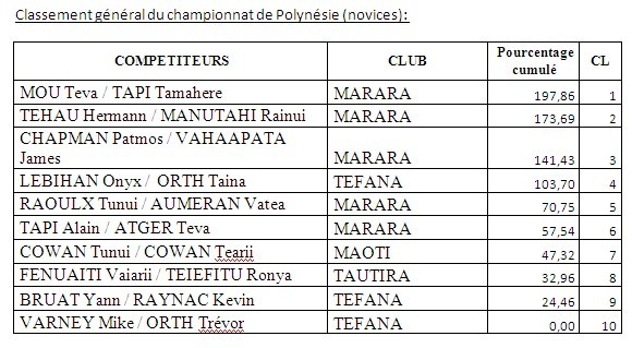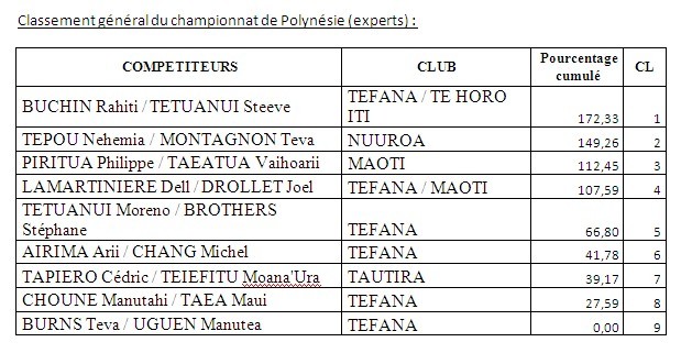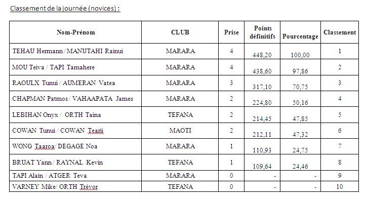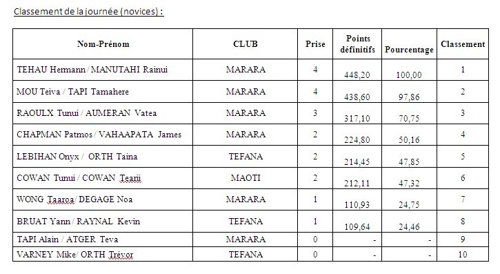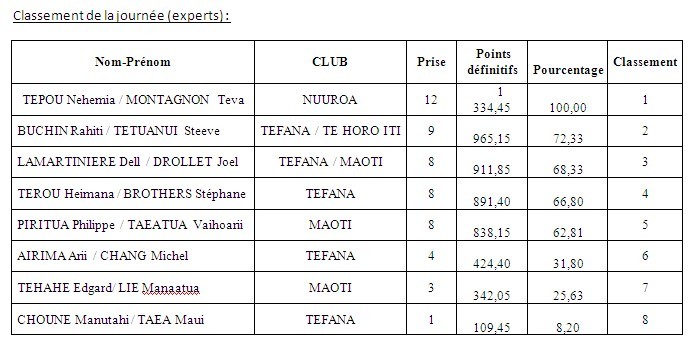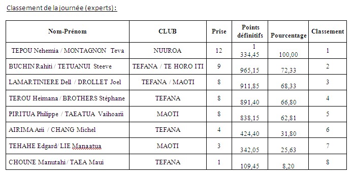 Au final, seules 2 équipes descendus vers le mārō sortent leur épingle du jeu. La paire novice Herman TEHAU et Rainui MANUTAHI qui sortent 4 prises et Joel DROLLET – Del LAMARTINIERE qui sortent 8 prises. Quant à Tepou et Rahiti ils sortent respectivement 12 et 9 prises et prennent les premières places en experts. Chez les novices on retrouve les deux mêmes équipes que la première manche.