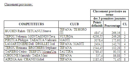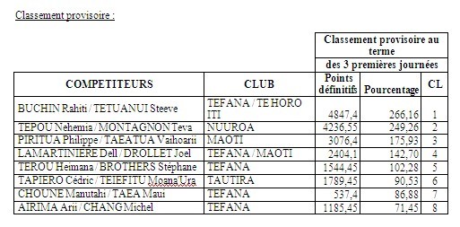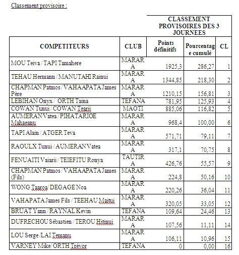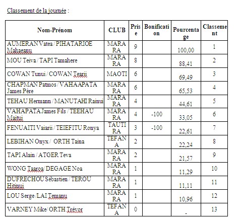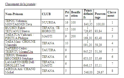 Steeve TETUANUI et Rahiti BUCHIN avaient pris une bonne avance lors de la première manche à Tautira avec près de 10 prises d’avance. Tepou NEHEMIA avait quelque peur réduit l’écart lors de la deuxième manche à Faa’a en devançant Rahiti de 3 prises. Ces 2 équipes, leaders du championnat par équipes, n’étaient donc pas venues pour faire dans la dentelle. Et en effet, dès le départ les 2 équipes se lancent sur la même zone en direction du motu. Le combat est d’autant plus intéressant que la majorité des autres équipes ont pris le même cap et en aucun cas elles n’allaient laisser champ libre aux 2 équipes ténors. Le directeur de compétition, Alféo PIHAATARIOE, navigue entre les équipes et chacune se renseigne sur le nombre de prises des adversaires. Si Teva MONTAGNON et Tepou NEHEMIA plombent jusqu’en fin de zone, Steeve TETUANUI et Rahiti BUCHIN bifurquent sur un caillou à l’intérieur puis reviennent en boogie dans la passe près de la bouée de départ. Cette stratégie aura été salvatrice pour les 2 compères puisqu’ils feront 6 prises durant la dernière heure. Malheureusement pour eux, leurs adversaires en feront une de plus au total et gagne ainsi la manche. Néanmoins, BUCHIN – TETUANUI se maintiennent en tête au classement général. Vaihoarii TAEATUA et Philippe PIRITUA complètement le podium de la journée et se maintiennent à la 3ième place au général.