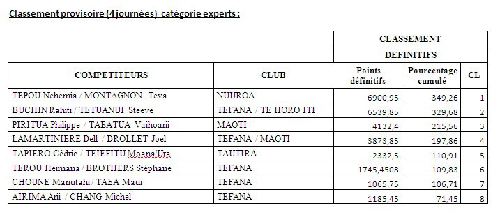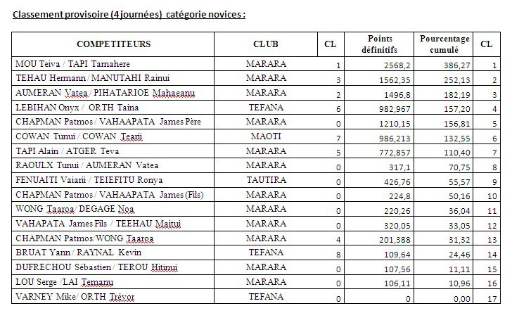 Du côté des novices, la journée aura été très difficile. Le courant, qui n’a cessé de croître, n’aura pas permis à ces équipes de s’exprimer pleinement et plus de la moitié des duos ne sortira pas plus de 2 prises. Teiva MOU et Tamahere TAPI, réguliers depuis le début du championnat confortent leur place de leader provisoire grâce aux 6 prises effectuées. ils devraient normalement remporter le championnat. Par contre, la deuxième place reste ouverte notamment pour le duo de l’AS Marara Maheanuu PIHATARIOE et Vatea AUMERAN qui pointent déjà à la 3ième place du classement provisoire alors qu’ils n’ont participé qu’à 2 manches sur 4. A noter aussi la régularité des 2 féminines qui se maintiennent à la 4ième place au classement provisoire laissant bon nombre d’équipes masculines derrière elles.