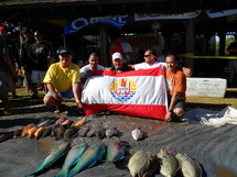 Comme à l’accoutumée, 3 zones sont définies pour la compétition dont une de repli. Durant les repérages, l’équipe tahitienne décide d’exploiter et fouiner la zone 1 sous le vent. Les 2 autres zones portent encore les stigmates de la tempête qui avait sévi une semaine auparavant. Dès les premières heures de repérage, un haut fond balisé par une bouée de navigation avait été repéré à seulement une cinquantaine de mètres de la bouée de départ et celui-ci présentait une belle structure avec des prises variées. Les organisateurs ayant opté pour cette zone pour la première journée, la sélection a placé ses deux équipes sur ce haut fond entre celles de Calédonie, de Nouvelle-Zélande et de Hawaii. Les tahitiens optent alors pour une pêche plus technique à contrario des autres qui décident de plomber et d’aller chercher le poisson. Nos pêcheurs enchaînent agachons sur agachons et sortent liches, daurades... Durant les dernières heures, une équipe tahitienne (Tarahu – Tetuanui) file en direction des falaises vers le bord. De longues dalles renferment de gros nānue et ume qui complèteront la pêche des tahitiens ainsi que des perroquets. Durant la dernière heure, la deuxième équipe revient vers la bouée de départ en raguant les fonds. Teva Montagnon sort un autre gros perroquet māmaria et son coéquipier Joel Drollet enchaîne sur une grosse carangue… la plus grosse prise du championnat. Compte tenu des informations qui circulent entre les bateaux, les pronostics sont bons pour l’équipe tahitienne et la pesée vient confirmer le tout. Tahiti affiche 39 prises soit 5 de plus que la sélection locale et bien loin devant la sélection néozélandaise vainqueur des Océania 2011.