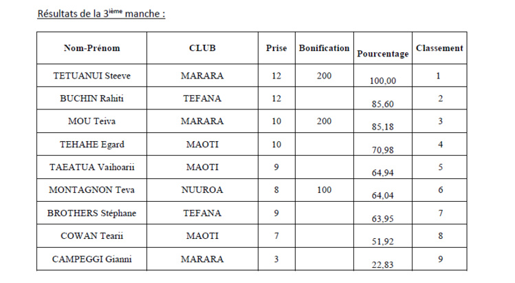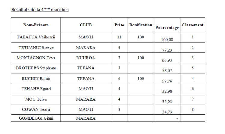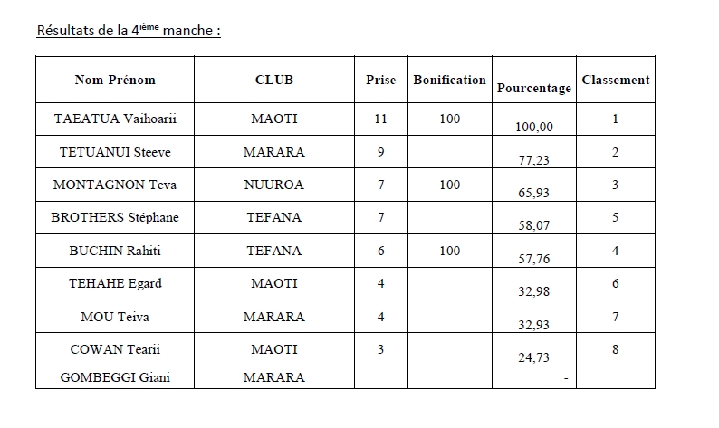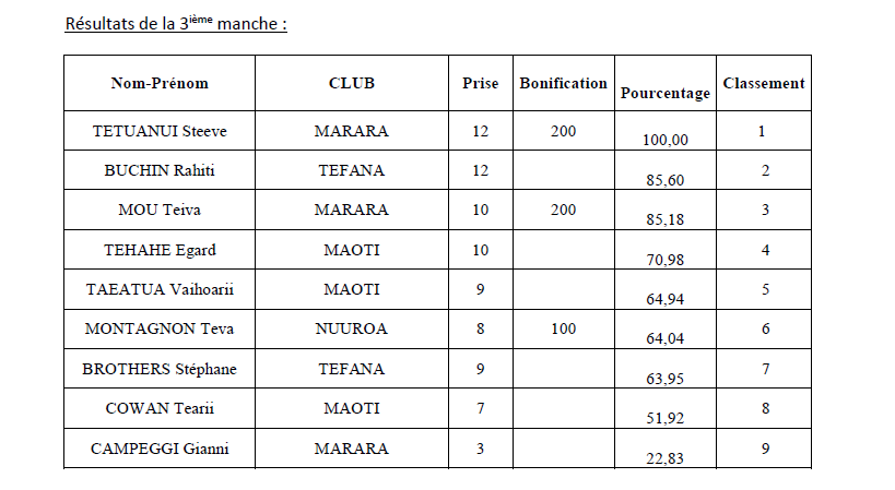 La journée s’annonce difficile car cette zone est réputée encore moins poissonneuse que celle de la veille. De plus, le poisson se situe plus sur les 2 fins de zone. Il faudra donc nager pour espérer accrocher du poisson à sa bouée. Et ce que font tous les pêcheurs au top de départ dont notamment Vaihoarii TAEATUA, Tearii COWAN et Teva MONTAGNON qui foncent sur Fa’atauti’a. Teiva MOU parti sur la même zone rebrousse chemin au bout de la première heure et tente de prospecter de l’autre côté. Au bout d’une heure, les résultats ne sont guère enchanteurs et chaque pêcheur tente d’exploiter chaque apnée pour tenter de sortir quelques prises. Vaihoarii se positionne en début de passe et travaille techniquement le tombant de la passe. Il sera le seul à sortir plus de 10 prises. Steeve TETUANUI parti dans la direction opposée présentera 9 prises dont 1 beau pa’a’aihere manini pris en début de pêche. Teva MONTAGNON qui aura poussé sa pêche jusqu’au bord de la baie de Fa’atauti’a complètent le podium avec 7 prises dont une bonifiée.